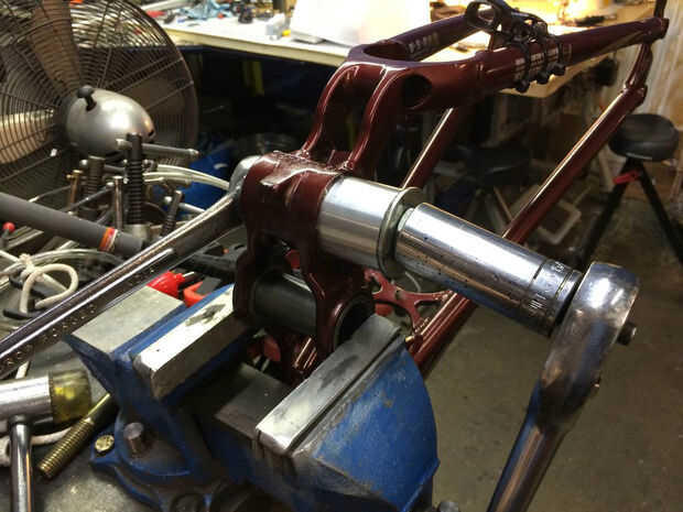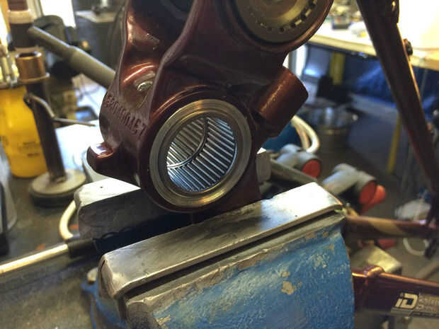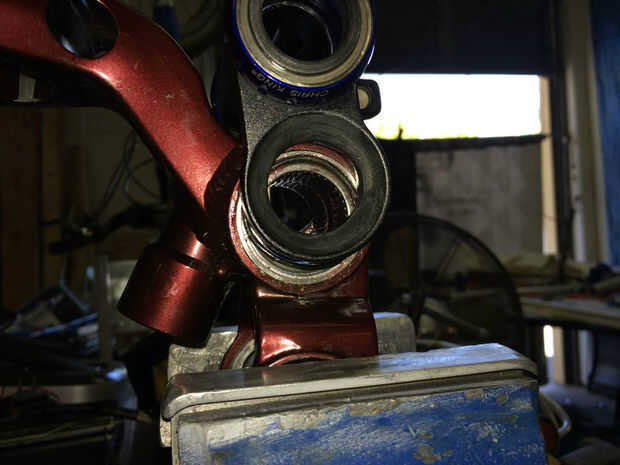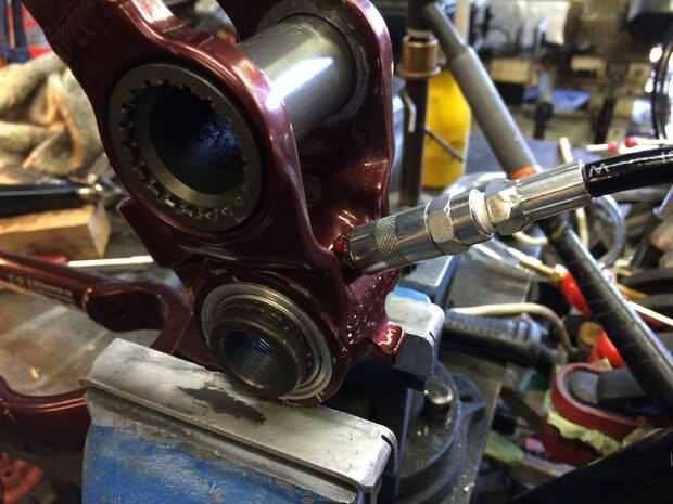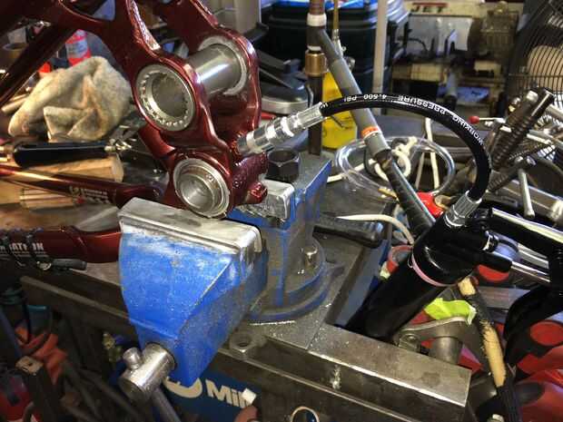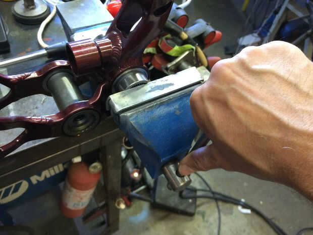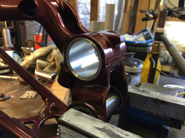 Una vez realizado el mecanizado, el buje y rodamientos se presionan. Una vez más, usted puede tener la tienda hacerlo o intentarlo usted mismo. Las fotos de arriba muestran el proceso. Una vez que presiona en su lugar hasta el buje y los cojinetes son perfectamente centrados. Taladro y toque un agujero para un zirq ajuste exactamente como se muestra en la imagen una vez que se presiona el buje. Son típicamente 1/4-28 hilos. Usted puede conseguir un zirq montaje en línea o en una buena ferretería. Esto le permite simplemente engrasar los rodamientos de una vez en un rato (sin desmontar) y tiene el beneficio añadido de sujeta el casquillo en su lugar. Empuje el pasador-pivote en lugar y bomba de grasa en la zirq hasta que exudan hacia fuera. Gire el pasador en ambos sentidos al hacerlo para distribuir uniformemente la grasa. Adquirir dos O-rings 1-7/16" OD x 1/16". Están en la sección de fontanería de una ferretería buena. Cuidadosamente instale al operador de soporte inferior sobre estas juntas tóricas garantizar que permanezcan en su lugar mientras lo hace. Ver la imagen. Tienen una capa de grasa sobre ellos. Instale los pernos de apriete moderadamente, comprobar para el enlace, volver a montar y luegohizo. Disfruta el nuevo encontrado silencio mientras pedalea hasta su subida favorito. (quién dice que tienes que tirar estas motos una vez que empiezan a crujir?!) Paseo en!