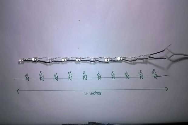 1 lugar el primer led y empezar a soldar. Atach el cobre al ánodo del alambre y cubrir con el calor del encogimiento del tubo y repita esto hasta que todo el led Haz soldadura.