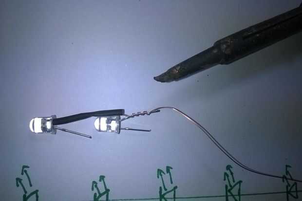 Ahora que se de la soldadura de 10 led de uno por uno. Pero que ese cátodo debe soldar con el cátodo y ánodo se suelde con el ánodo.