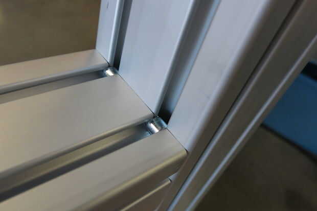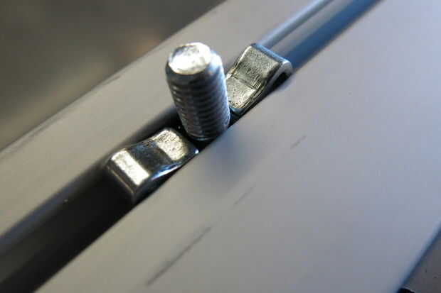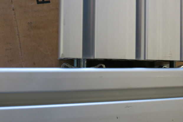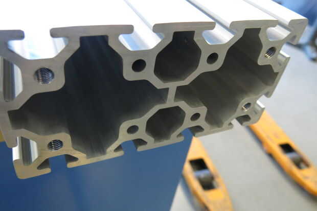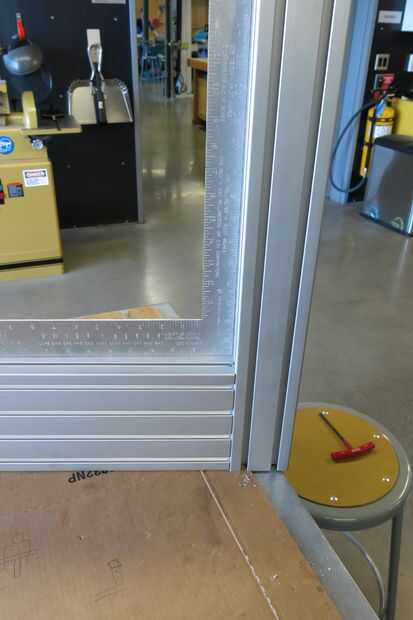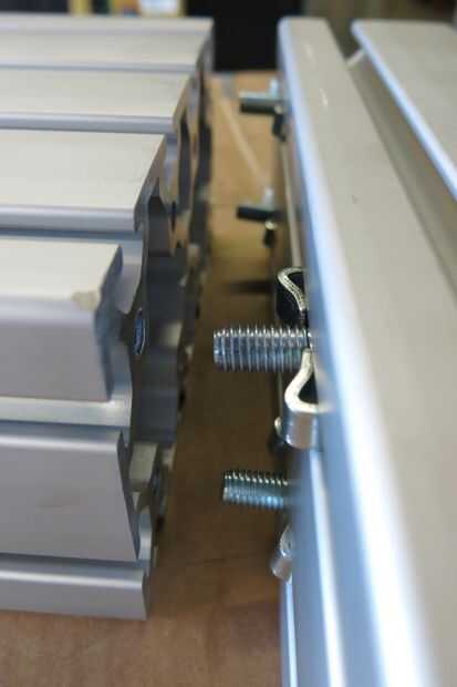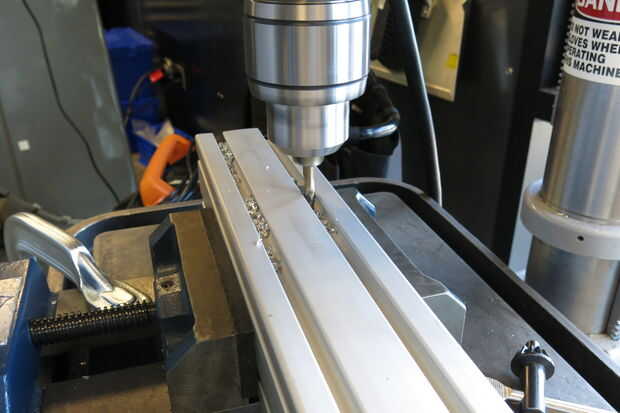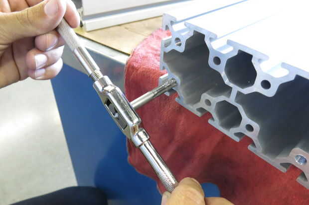 Asegúrese de que el final de la columna principal se corta Plaza a sus canales para que los canales verticales, una vez Unidos, será perpendiculares a los canales horizontales. Esto podría ser difícil de hacer con un gran pedazo de extrusión de aluminio... Afortunadamente mina vino bastante cuadrado al vendedor. Ahora toque en los orificios del extremo en el borde de la columna principal para que se fije la columna vertebral vertical. Como he mencionado anteriormente el 80/20 está listo para un toque específico, en mi caso M8 x 1,25.
