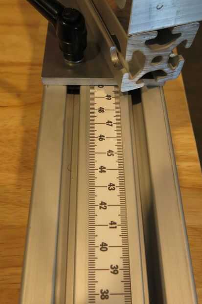 La columna vertical se hace de extrusión de 80-80. Debe ser lo suficientemente largos para permitir que el tubo principal que se celebrará en varias alturas. Altura del tubo principal no es una medida primaria de diseño del marco. Sin embargo, con el diseño de Arctos se utiliza para configurar la plantilla para una estructura particular. Me decidí por 700mm de la columna vertical. Esto debería permitir a construir bicicletas tan grandes como el que se deba. Porque tubo altura es una medida usada para la creación de la plantilla, que quería un dispositivo de medición del embutido. Pedí adhesivo respaldado cinta métrica métrica de McMaster Carr. Usé el Bridgeport molino a una arboleda de la misma anchura como la cinta de la mayoría de la columna vertical. Alineación de esta cinta se basa en el conjunto del tubo de la cabeza, voy a comentar más en esa sección.