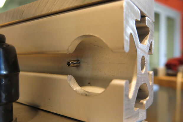 El pivote fijo fue creado usando un pice de un perno y algunos tornillos. Cortar el vástago roscado de un tornillo de M8 de sólo tenía una varilla sin rosca con una tapa en el extremo. Usé un molinillo para moler esta tapa hacia abajo para que sea delgada. La idea es la tapa del perno se inserción en a la placa base y sobresalgan de la parte superior. El 80/20 se parte en este pin y ajustados los tornillos lo sostenga en su lugar. Este pivote se encuentra directamente debajo de la base tubo de la dirección. La colocación del perno no es importante sólo movimiento de cono en la posición correcta. En mi caso yo Marque con una puntuación en el 80/20 para indicar la ubicación de dos del cono (1" y 1 1/8").