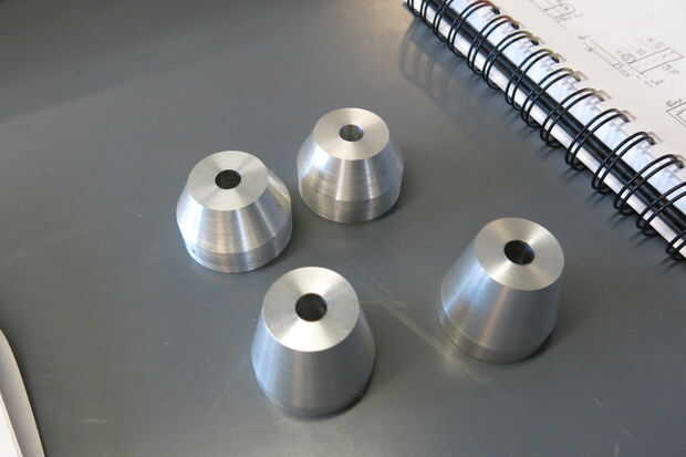 Toque en el orificio que debe ser aprovechado. y las clavijas en los agujeros de perno. Ahora para los conos. Los conos no necesitan ser complicada. Como el diámetro mayor del cono es más grande que el tubo de diámetro interior mayor que desea mantener y el diámetro menor del cono es más pequeño que el tubo de diámetro interno más pequeño que desea mantener, trabajan. Hice dos tamaños uno que funciona con tubos de cabeza de 1" y 1 1/4" y uno funciona con 27,2 mm - 31,8 mm diámetro de tubo de asiento interno. Me centro los perforados para la tornillería de M8 (. 316"). Más tarde decidió Avellane los agujeros para las miradas. También usé el torno hacer unos conos para el montaje de BB. Terminé haciendo dos tipos diferentes. Uno era un cono muy similar a las que hice para el HT y ST pero más grande (de 1.5" de diámetro grande, 1.25" diámetro pequeño). El otro era más de un cilindro de un cono. Usé un diámetro más pequeño de 1,375" y un labio con un diámetro de 1.5". 1,375" parte del cilindro encaja perfectamente la caja del pedalier. Este es el que causa problemas con la expansión y que va a funcionar mejor en acero. Para los conos de la cáscara de BB perforé un orificio de 5/8" por lo que se resbalan sobre la barra de acero en el conjunto de BB.