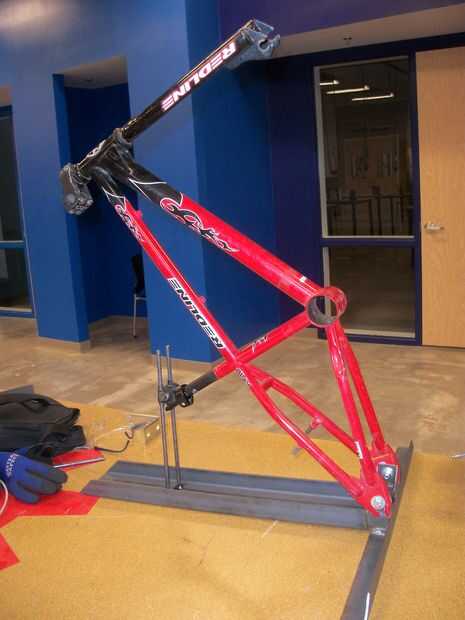 Una base para apoyar la estructura del edificio fue mi primer objetivo. Usé algunos hierro de ángulo de 1.5" para hacer una doble T. patas Unos soportes soldados proporcionan puntos de montaje para los agujeros de perno del eje trasero. varilla de 1/4" ajuste las abrazaderas que se utiliza para mantener el asiento en el post, así que unos pedazos de varilla eran soldados a las patas para apoyar el montaje de postes de asiento.  Desplazamiento hacia adentro y hacia afuera un poco la tija de sillín y las abrazaderas del asiento a lo largo de la barra, el ángulo del eje de la horquilla delantera puede ajustarse para apuntar al norte celeste. Un pedazo de tubo cuadrados 1.25 coincide con el interior espacio de barra y proporciona soporte triangulada. Esto fue soldada con autógena en después de este cuadro.