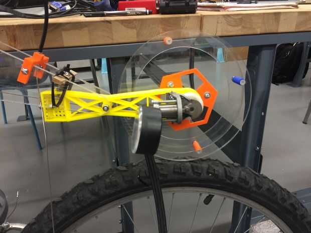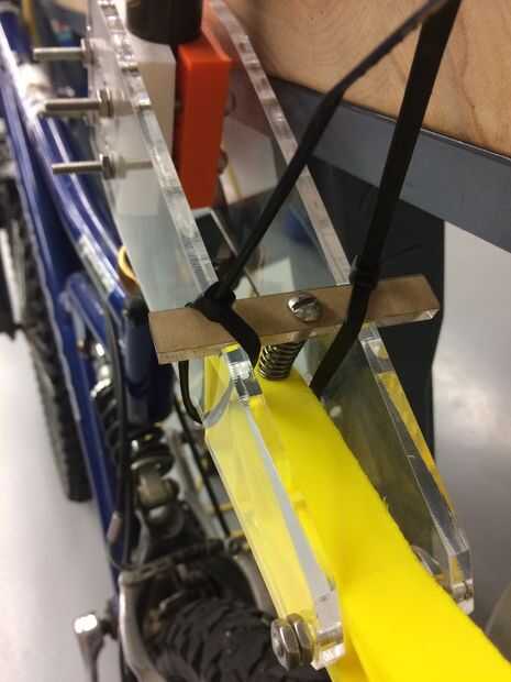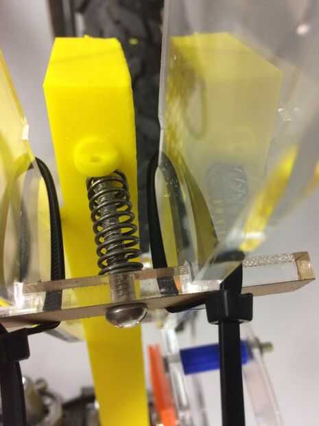 Todo el mecanismo se mueve hacia arriba y hacia abajo sobre el perno en los extremos de los soportes. Esto se logra con un resorte y una palanca de freno barato que compré en una tienda de bicicletas local, payaso perro bicicletas. Los chicos de la tienda me vendieron una manija usada y me corte el alambre y la vivienda que necesitaba. Esto me ayudó un montón.