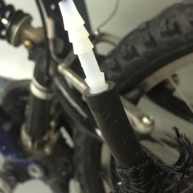 Ahora el compresor se conecta a una manguera más larga que puede llegar a cualquier lugar en la bicicleta, desde la parte trasera a un tanque hasta la parte delantera para llenar para arriba un manillar montado arma de agua:)