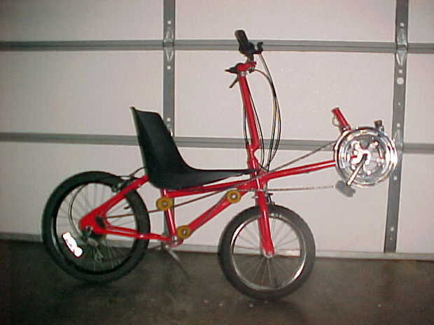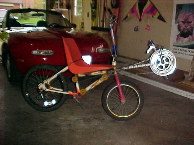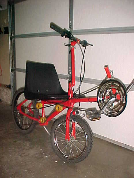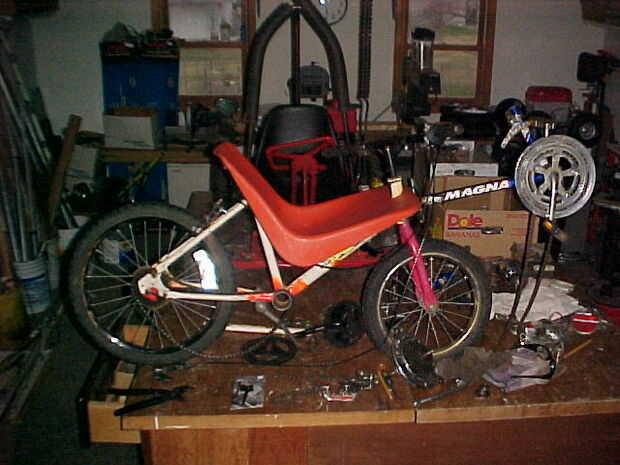 I cereza escogió el resto de las partes y colocado en una 20" cinco velocidad rueda trasera, rueda delantera de 16" y bifurcación, un juego de palancas de freno, palancas de cambio y manivela frontal de una velocidad de 26" 10, un par de apretones de mano y un manillar recto de una BMX. También varios de los marcos de la bicicleta había seleccionada como material donante para mi marco 'personalizado'.