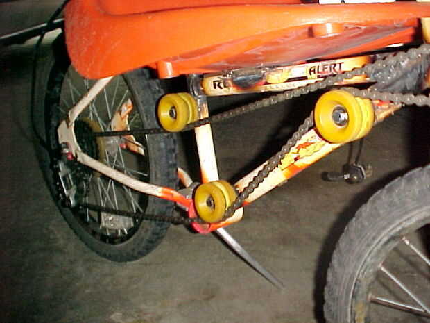 He comprado varios enlaces principales para crear una cadena suficientemente larga para cubrir la distancia necesaria de las cadenas de tres de las bicicletas de donantes. Encaminamiento de la cadena era un poco un desafío. Enredarse un patín abandonado y salvado las tres ruedas restantes de él, hice y perno de eje de 3/8" y montar la rueda en mi taladro. El taladro sirvió como un torno vertical de las clases y corte una ranura en la rueda de uretano con una lima plana. I soldar las tuercas al marco de la bicicleta en los puntos apropiados para la cadena a través de las ruedas de guía de cadena nueva acanalado y atornilladas a la estructura. La derailure trasera mantiene la tensión de la cadena.
