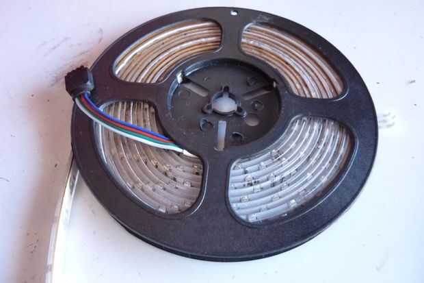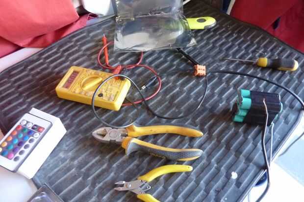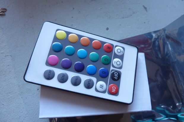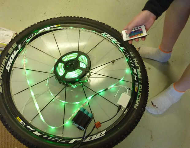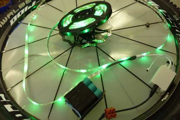 Después de esto podremos hacer probado un paquete de baterías para reemplazar la fuente de pared estándar para el RGB LED 5 m tira. Utilizamos tres 18650 baterías recargables en serie para proveer 1.1Ah. Así que la luz de la rueda puede funcionar por 2 horas antes de necesitar recargarse. (Nota que puesto que esto es un prototipo todavía para integrar un circuito de protección para recarga y descarga de las 18650 baterías que es esencial para la seguridad)