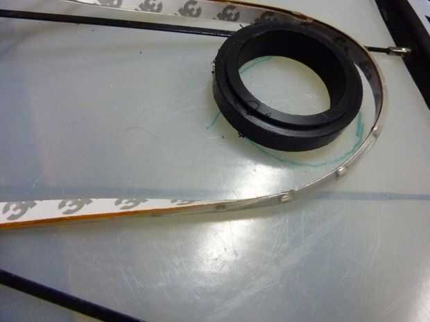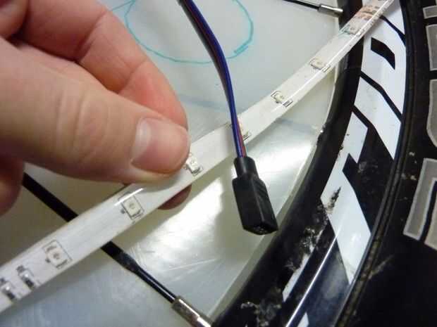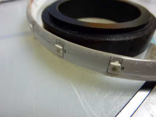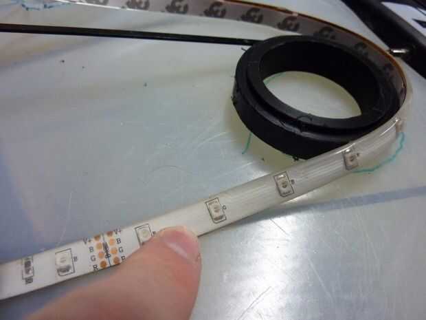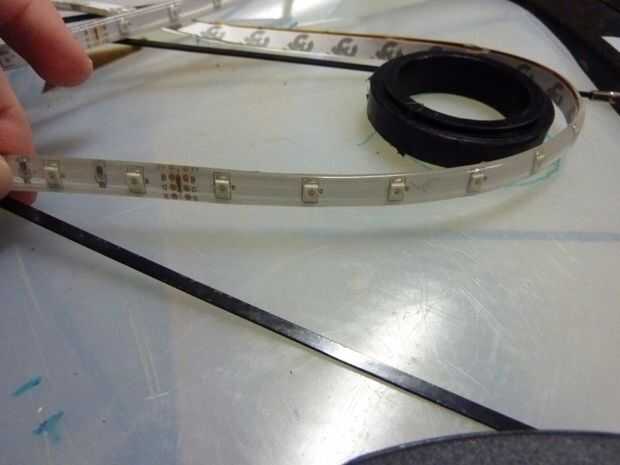 Decidí también la posición en la que las caras de la tira de LED (la franja tiene un área de visión de 180 grados). Para la rueda de la luz y dispersar la luz entre las conchas luz significó hacia hacia dentro de la tira era lo mejor. Sin embargo decide enfrentar la mitad de la tira a cada lado de la rueda. Mientras que el restante joing tira entre (medio del cubo y los orificios de aire) haría las luz más conchas.