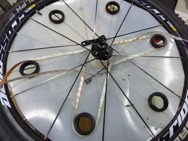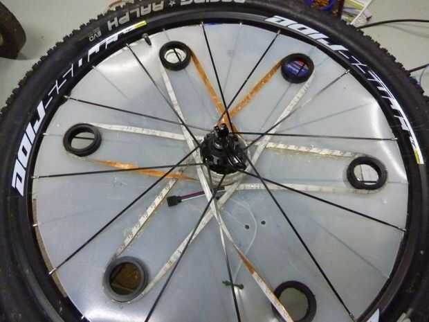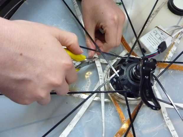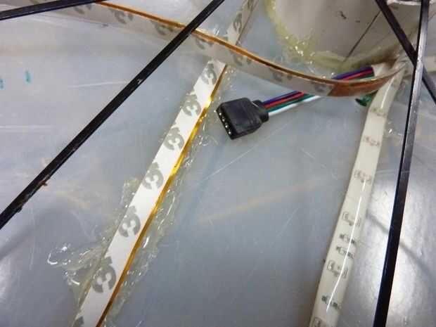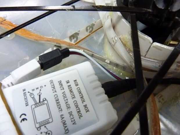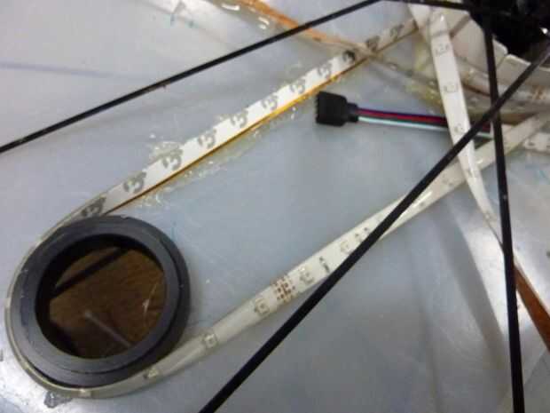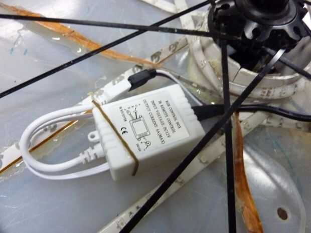 Después de pegar abajo de la tira de LED para el arreglo solicitada para un par de vueltas me di cuenta que había pegado el conector incorrecto para el controlador. Después de rasgar para arriba otra vez y volver a usar la pistola de pegamento caliente estaba en el negocio, pegado abajo de la tira fuertemente contra la cáscara. Al pegar la tira con el LED tocar el lado de la cáscara, traté de pegar sólo al lado de la tira o entre cada LED. Sin embargo el pegamento terminó fluyendo hacia el LED y oscurecimiento de un poco. Cuando he probado la luz rueda noté diferencias significativas especialmente como la rueda estaba moviendo ambos lados de la luz terminaron igualmente brillante. Yo también caliente pegado el regulador hacia abajo, tratando de permitir un fácil acceso al cable de alimentación y LED cable dejando todavía espacio para la segunda cáscara exprimir dentro de los radios. Luego corté la tira en las líneas de corte exactamente en el centro.