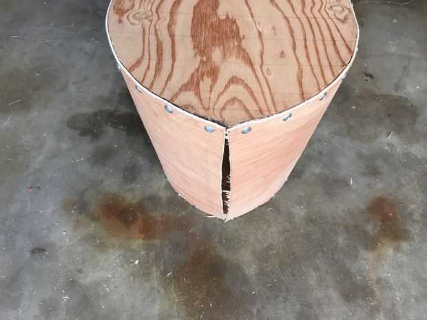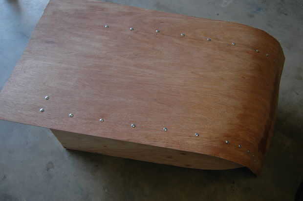 Comience por colocar una gota de pegamento en cada borde en el lado de su sidecar. Alinee su madera contrachapada fina y comenzar a enroscar en la piel. Utilicé tornillos de listón para crear un aspecto casi como remaches y colocó 4" aparte. Utilice una regla para ayudarle con la distancia desde el lado de donde poner los tornillos para que no te pierdas el armazón atornillando a. Comienzan en la espalda y mantenga su forma hacia abajo, cambio de lados de cada otro tornillo de trabajo. Esto ayuda a tener una segunda persona para ayudar a mantener la piel en su lugar. Continúe hasta que la piel es totalmente enroscada hacia el frente.