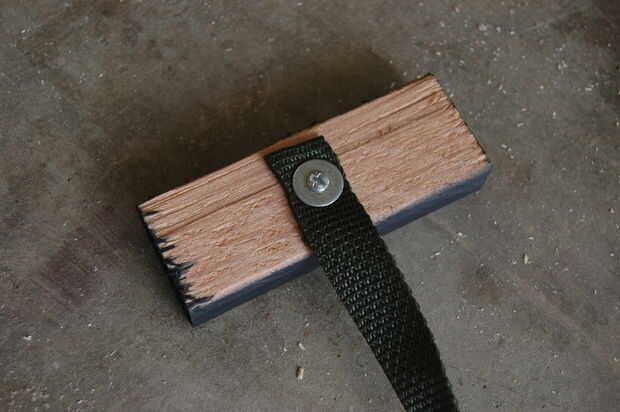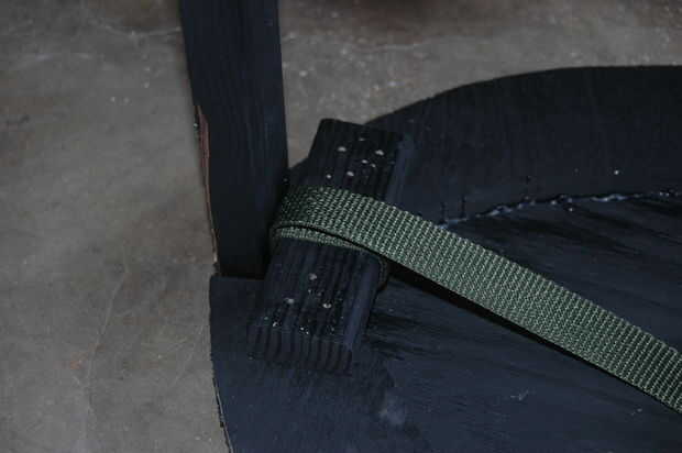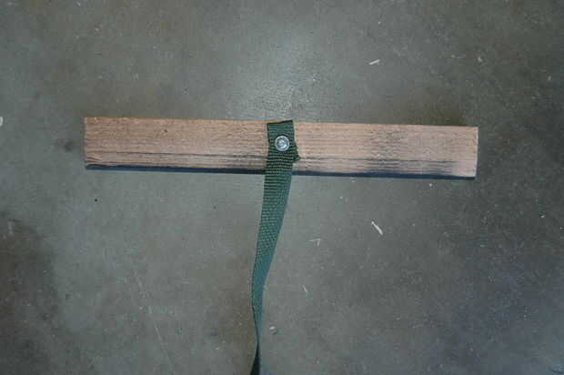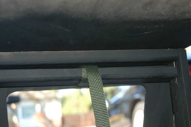 Para la parte superior detrás de correa, cortar una longitud de 11-1/2" 1 x 2. Esto encajará entre los dos soportes de 1 x 2 en su sidecar. Pintar esta pieza de 1 x 2 negro para que coincida con su interior. Taladro y tornillo en 3' pedazo de correa (usando una arandela) para el centro de su 11-1/2" 1 x 2 de largo. Envuelva la cinta alrededor de la 1 x 2 unas cuantas veces y utilice su pistola de clavos para clavar esta entre los dos soporte de 1 x 2 (ver fotos).