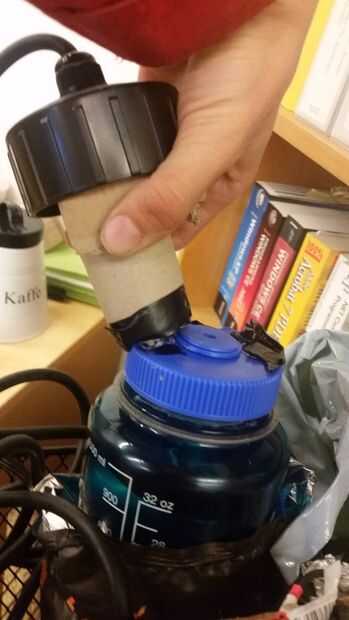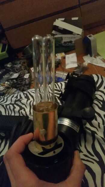 Hemos blindado el lastre ligero que estaba fuera del agua con la cinta eléctrica y cartón. Sin embargo, la botella sí mismo es necesario blindar así. La bolsa en la foto no era suficiente para la luz, sólo la botella, como parte de la luz UV-C escapó de la parte superior de la botella. Por lo tanto, usted necesita un material grueso que cubre todas las áreas posibles suficientemente. Esto es importante como UV-C puede ser muy perjudicial para los ojos! Asegúrese de cubrir la botella hacia arriba, incluyendo la tapa, lo suficientemente.