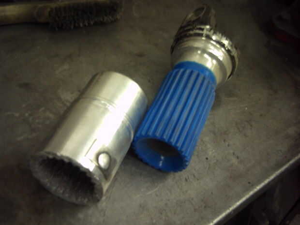 Una línea de conducción es un tubo hueco con Yugos soldadas a los extremos del tubo. La línea de transmisión que usé tenía un yugo común deslizante en un extremo y un yugo de Cardan en el otro. Dependiendo de qué extremo de la línea de transmisión que desea utilizar, usted necesitará hacer algunos trabajo de preparación. Si eliges el final de la Junta te recomiendo quitar la junta antes de cortar el yugo. Si eliges el final conjunta slip que necesita cortar el fuelle de goma y sacar el yugo externo de la articulación de deslizamiento. Cortar tanto el extremo del yugo de la línea de transmisión fuera posible. Moler el extremo hacia abajo hasta que estés cerca de la soldadura, 1/4 in-1/2 en.