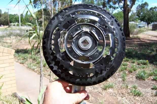 Primero como una bicicleta vieja - el original anillo acero 2 gearsets no estaban disponibles, así que había modificado un gearset de 3 anillos y luego movió más cerca al marco por montaje de un cigüeñal de la longitud 110mm, en vez del cigüeñal de 122 mm - para que el derailer delantero podría alcanzar en el engranaje externo y la alineación de la cadena fue bastante bien con la parte posterior engrana en la rueda trasera.