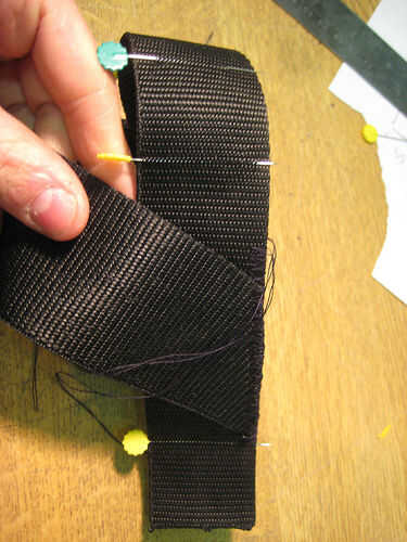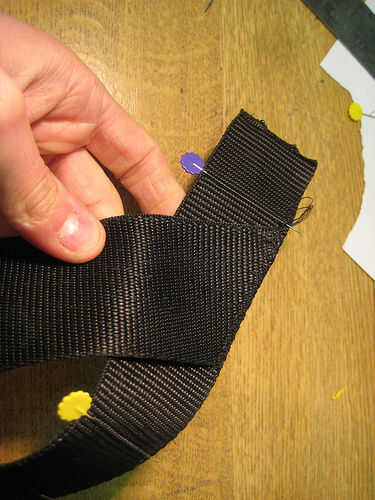 Coser las dos piezas de cinta juntas como se muestra en el diseño y las fotos. Utilizar una puntada cerca del borde y hacer dos pasadas de dureza. Atar bien. Hay dos juntas a coser para cada toeclip.