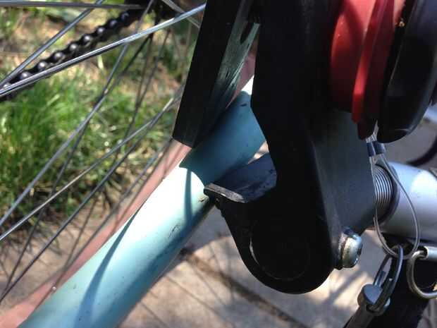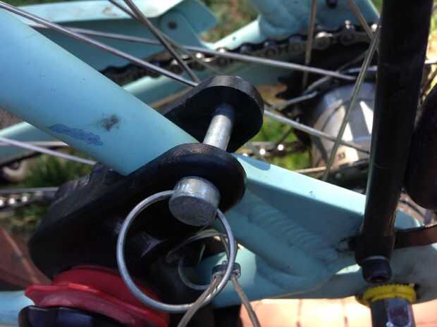 - Ahora deslice el enganche todo detrás (foto #4) hasta que eres capaz de poner el pin en alrededor de la estancia de cadena superior.