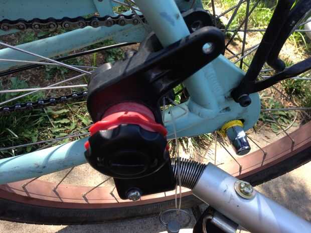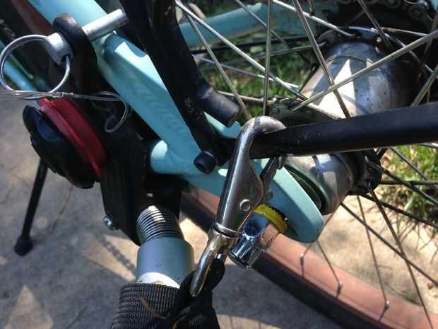 Este remolque requiere reemplazar el eje de tu moto con una especial que engancha al carrito. No se me da el eje así que tuve que modificar cómo encajan el trailer a mi bici. Como resulta, pasa el resto del enganche para ajustarse a mi cuadro de la bicicleta. Me quedé sorprendido.