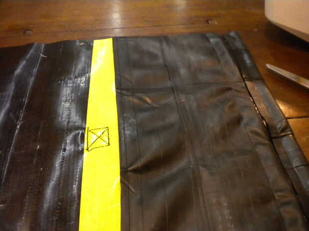 3) colocar la pieza Junta doblada de tubo en el centro exterior de la bolsa justo debajo del bolsillo (o más) con la corona hacia arriba hacia/sobre dónde está el bolsillo. (Asegúrese de que está por debajo del bolsillo, o vas a coser el cierre del bolsillo!)