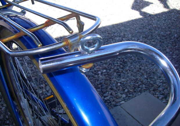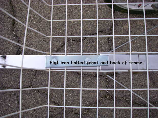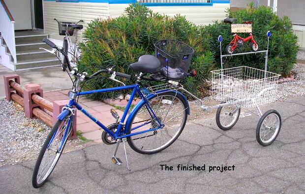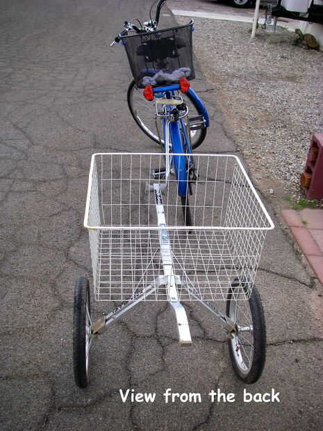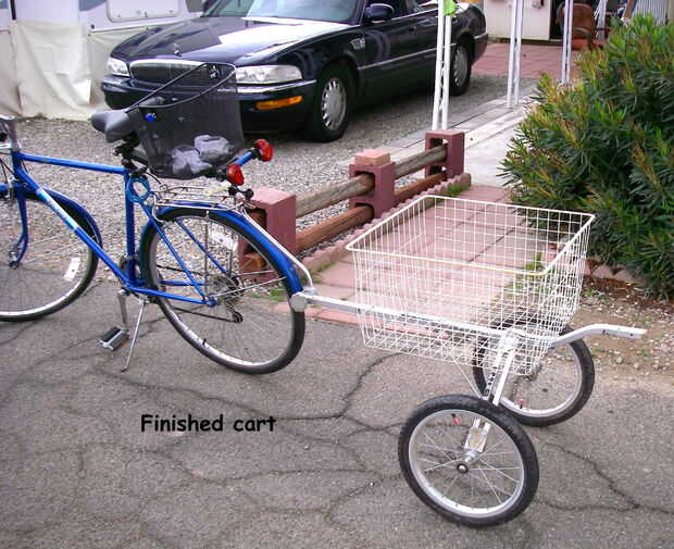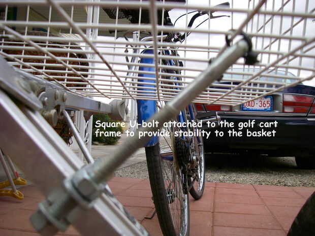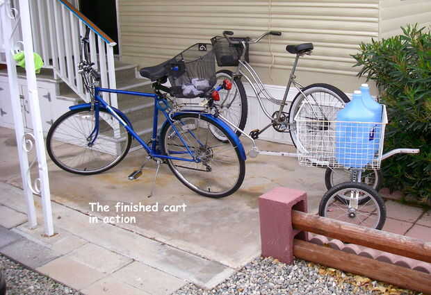 Lo primero que hice fue sacar las ruedas originales que estaban en el carro de golf y reemplazado con dos aire llenado de neumáticos y llantas más grandes. Luego se me quitan los soportes del carro de golf que se llevó a cabo en la bolsa de golf. Esto me dejó con un marco pelado. Montara la canasta en el marco del carro de golf con la plancha y las tuercas y pernos. Esto se hace perforando los agujeros a través de la plancha y el marco. La plancha la cesta a la estructura firmemente, pero no tenía soporte lateral. Spam a través de mi hardware y me encontré dos pernos en U de 6". Los pernos para los soportes de la rueda del carro de golf y luego zip atado las tapas a la canasta. Me quité el grop de mano en el carrito de golf y perforó un agujero a través del mango. Ahora se conecta a mi bici con un perno y la tuerca. La manija del carro de golf es ajustable así que es fácil de obtener el carro. Ahora es muy constante y se transportan de 60 libras de agua. Funciona como un encanto, era fácil de construir y costo casi nada. Estoy seguro que tendrá muchos usos. Ver las fotos. Cualquier pregunta, por favor sólo Envíeme un correo electrónico. Gracias.