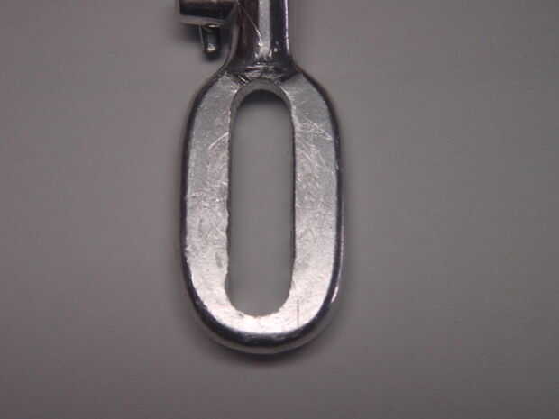 - Coloque la plantilla sobre la cara exterior del lazo calibrador. Ajústelo para que el metal restante después de la presentación será lo más uniformemente distribuido alrededor del agujero que usted puede hacer. Marca de la pinza con punta ultra fina Sharpie.