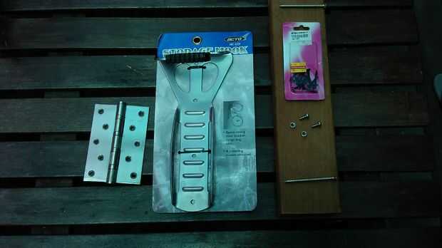 Bandeja y bisagra de 5 pulgadas resistente. El resto son tornillos para madera y tornillos y tuercas.