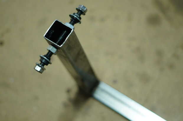 Nuestra plantilla está hecha de acero suave. 5 "x 1,5" x.125 grueso de pared y 1.5" de cuadrados de las columnas porque su lo que teníamos que poner todo. Perfore agujeros en la plantilla a la distancia en la que desea que la longitud del eje que. La nuestra es de 48 pulgadas. Luego utiliza el viejo 3/8 ejes de ruedas de bmx y había los en los orificios había montado en. Estos árboles serán utilizados para montar a las punteras de la horquilla y trasera durante la construcción del marco y soldadura.
