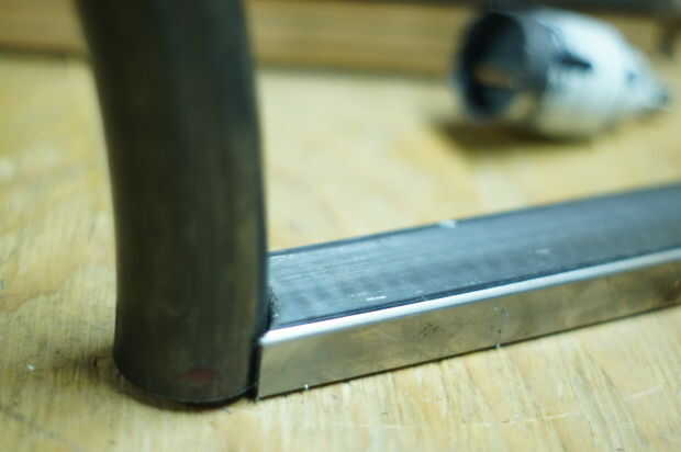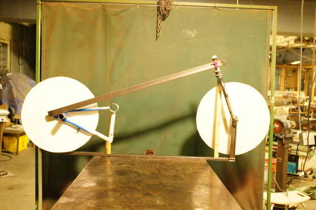 Mantener el extremo posterior de la llanta es importante. Para ello tomó un trozo de tubería de desecho para los reclinatorios y soldados entre los dos tubos superiores para actuar como un guardabarros trasero.