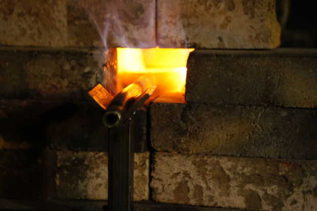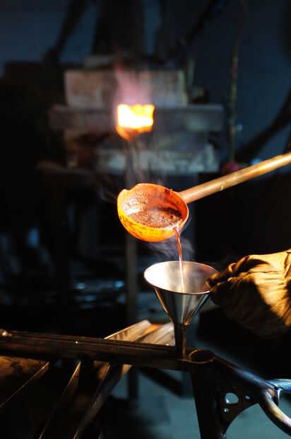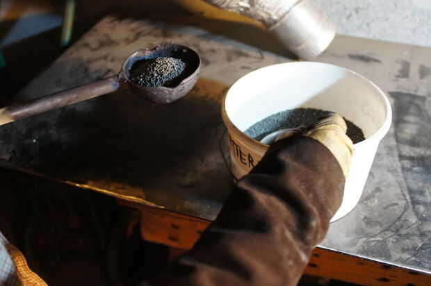 Ahora para la parte peligrosa desagradable impresionante. Llenado de la esfera hueca llena de cosas pesadas. Usando una forja de gas nos derritió diábolos de plomo y luego vierte el plomo derretido en la esfera. Un embudo es de gran ayuda durante este proceso. Nuestro es un modelo de as por unos tres dólares. Esto creó un lastre de 25lb. Todavía había espacio para más peso así que perforó un agujero en el tubo inferior del cuadro y llenó completo también. No trate de enfriar las piezas con agua. Sólo que lo hagan algo allí. Puede tomar una hora o más. Si no tienes un gas forja a su disposición un oxi/acetileno o el soplete de Gas MAPP también conseguirá el trabajo hecho. Si vas por este camino donde un respirador adecuado y hacerlo fuera si es posible.