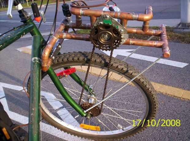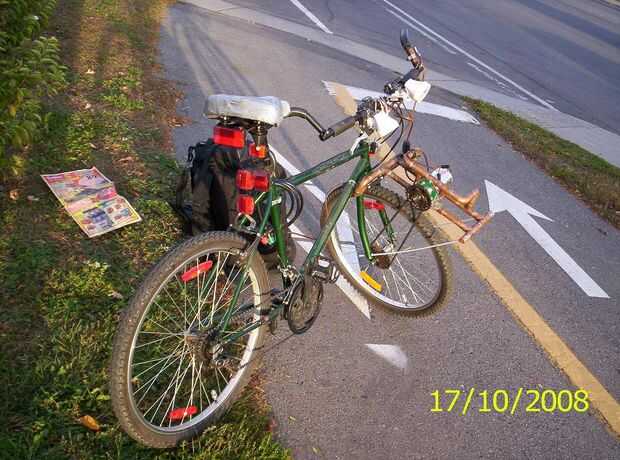 remolque de bicicleta eléctricaAccionado por un motor eléctrico y baterías, este remolque empuja una bicicleta. Una cambio de engranaje se monta en el manillar para que el piloto puede seleccionar el equipo adecuado en la rueda del remolque para lleg