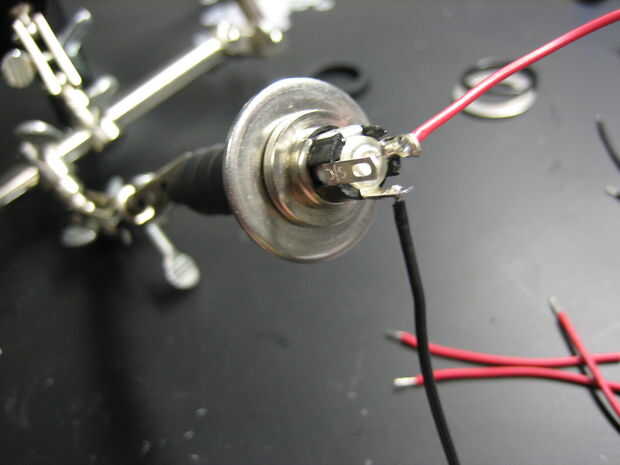 A continuación soldar los cables a la toma. Afortunadamente la toma es auto explicativo para que terminal es el pasador central. Sin embargo, usando un multímetro con un comprobador de continuidad en ella es una gran manera de asegurarse de que los terminales son correctos.