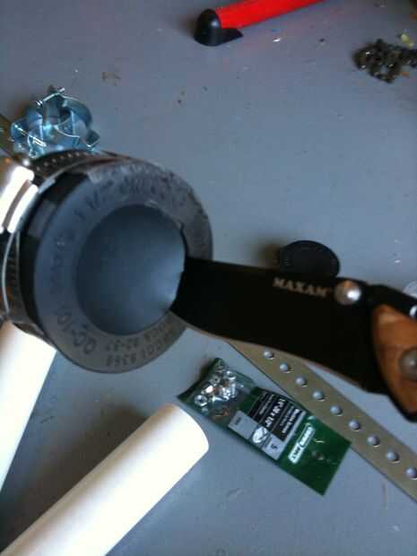 Tomar las tapas de 2 goma y corte un orificio en cada uno. Solo usé mi cuchillo de bolsillo que es muy fuerte, asegúrese de que su cuchilla de corte está afilada mantener el control de hoja. Mantener las piezas de goma cortado fuera de las tapas, utilizas estos más adelante.