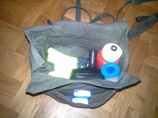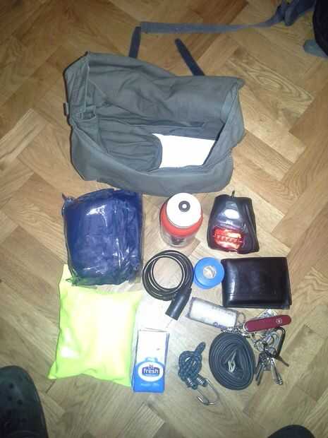 4 poner todas mis cosas dentro (son todas cosas que llevo conmigo en bicicleta fin de semana, dentro de la botella roja son mis herramientas, en bolsa azul es mi chaqueta de lluvia, en amarillo mi chaleco reflectante, y en bolsa negra es mis luces para la conducción de noche)