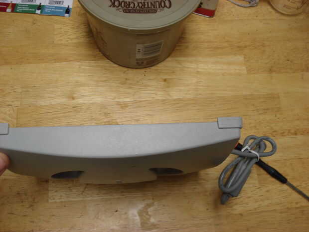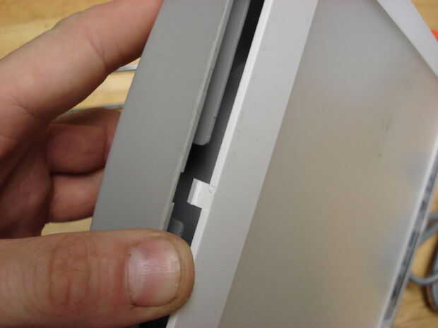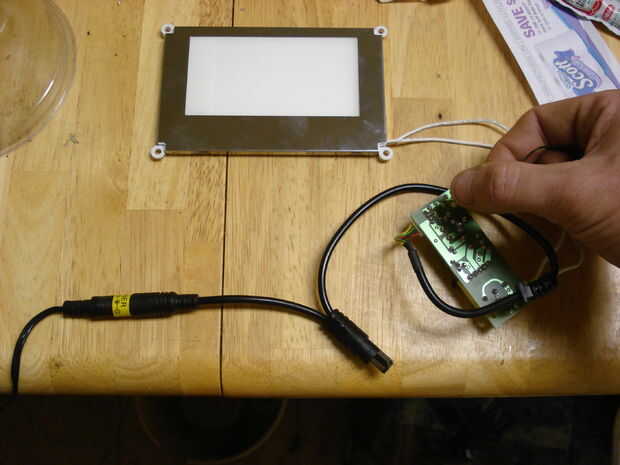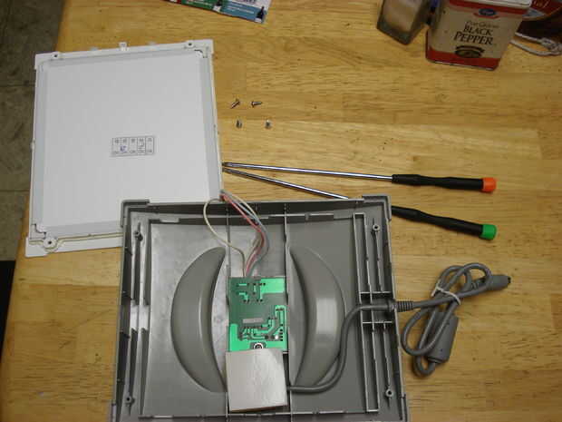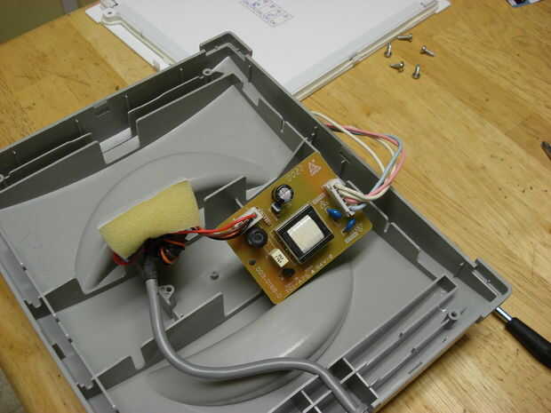 La siguiente serie de imágenes muestra un mucho más grande explorador adaptador, que es aproximadamente del tamaño de mi mano tendida. Salió un HP y también funciona a 12V, pero toma cerca de 1Amp. Tengo una idéntica he usado por varios años como una lectura ligera y es lo suficientemente brillante para ser incómodo mirar directamente en un oscurecido habitación si estás dentro de unos pocos pies (aunque hace un buen trabajo de iluminación de la habitación). Esta muestra la secuencia de tomar aparte--los tornillos que ves en las esquinas del marco son solo philips y todo lo que la mantiene unida más allá de ése es algunos pequeño clips en los bordes de la carcasa trasera gris.