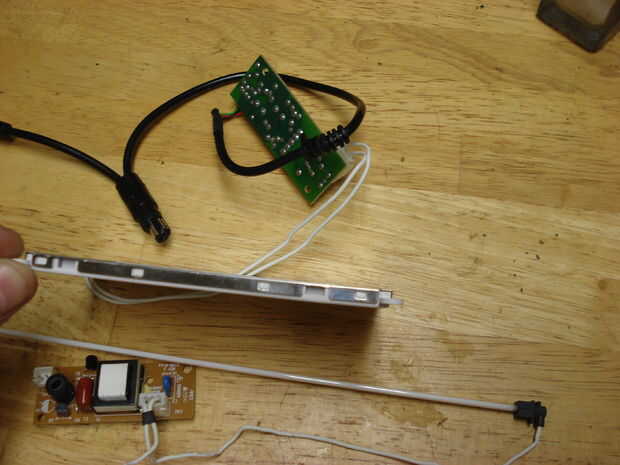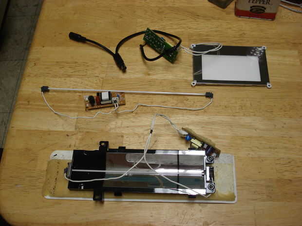 Primero son unas tripas de varios escáneres y tapas. Con la no cubierta, solo bombilla, es mecanismo real explorador que se mueve en la bandeja de debajo del vidrio. El pequeño rectangular fina por encima de él en la misma foto es de la tapa de un escáner, para su uso con diapositivas, transparencias, negativos, etc.. La tapa era bastante flexible y endebles, así que no lo guardo con la luz. Mismo puede decirse de la caja para la luz de fondo, que salió de un adaptador de tipo barra tira mucho como la de mi linterna de bicicleta real. La luz es más corta que la otra barra estilo uno usé y por lo tanto menos superficie y menos brillante, que es el principal motivo de que no usar éste. Se * le * haberme dejado poner el LED frontal, sin embargo, que no podía hacer con la linterna que terminó con. Todos estos se muestra a continuación funcionan en 12VDC y toman en cualquier lugar de acerca de 250mA a 700mA. Eso es un montón de energía, pero también es mucha luz.
