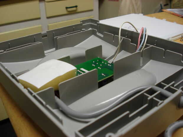 Es muy delgada, casi lo mismo que mi mano descansando cómodamente en una superficie plana, pero debido a la manera que ha hecho tiene mucho espacio interior. Puedes ver el fino (1/4", tal vez) módulo de luz sí mismo en su cara en la parte superior izquierda de la imagen completamente abierto. Siguiente muestra un ángulo oblicuo en el interior de la carcasa, que la profundidad de la caja donde usted podría poner su otra electrónica.