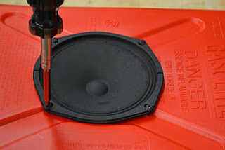 Simple altavoz de bajos de un viejo bidónPaso 1: Orificio marcaPaso 2: Perforar agujero de inicio entonces jigsaw el círculo hacia fuera de allí utilicé una lámina de madera no hay problemaPaso 3: Pruebe la colocación de altavoces También he añadido