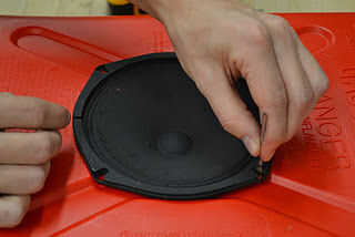 Simple altavoz de bajos de un viejo bidónPaso 1: Orificio marcaPaso 2: Perforar agujero de inicio entonces jigsaw el círculo hacia fuera de allí utilicé una lámina de madera no hay problemaPaso 3: Pruebe la colocación de altavoces También he añadido