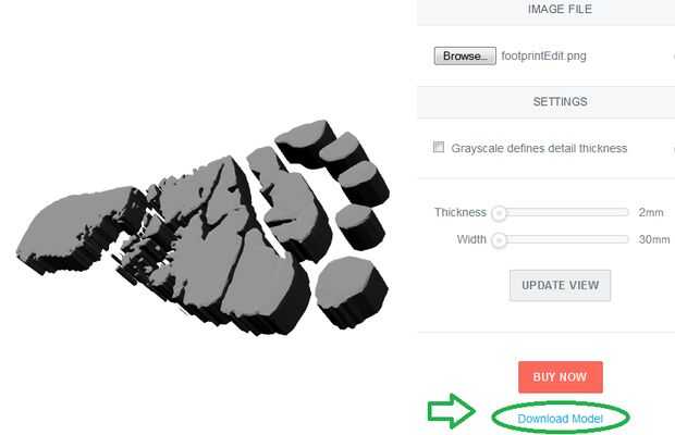 Usé la Shapeways Creador de la aplicación que le permite hacer una forma extruida de una imagen en blanco y negro. Usted puede controlar el tamaño y la profundidad en mm y si usted quiere experimentar con la textura, la selección de escala de grises puede ser elegida como una variable. (Si mi plantilla de copia de seguridad en pasos, tamaño de tu huella a alrededor de 60 mm).