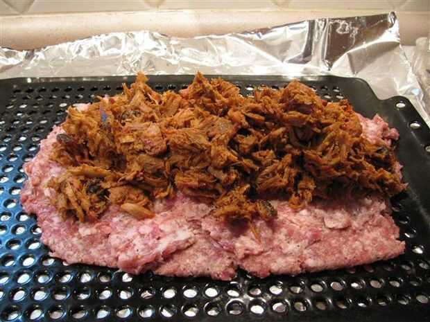 Ponga 2 libras de salsas cerdo tirado en el centro de las capas de fondo. Doblar los lados para crear un contenedor como estructura.