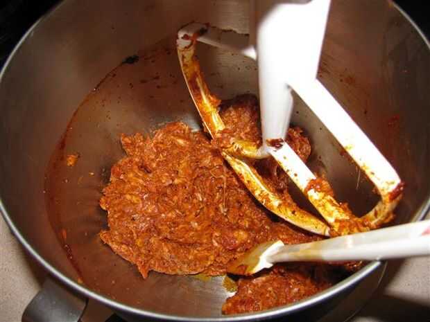 Colocar la carne, pasta de Chile y los ingredientes secos en tazón combinar. Utilicé mi batidora y funcionó muy bien.