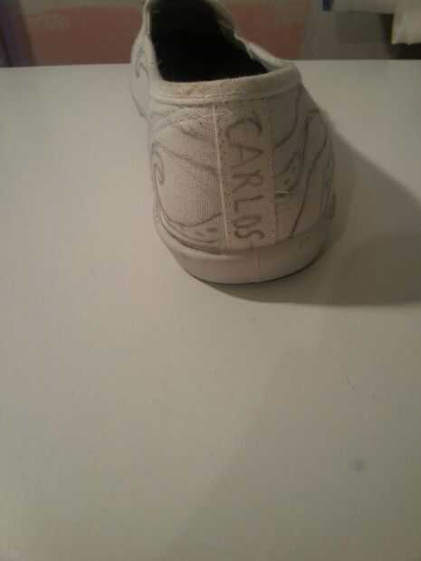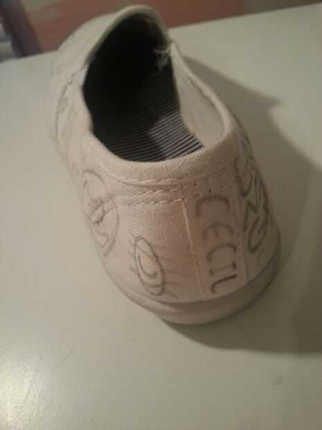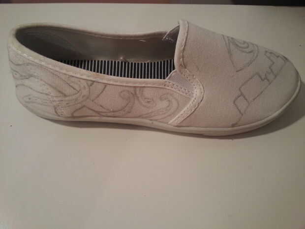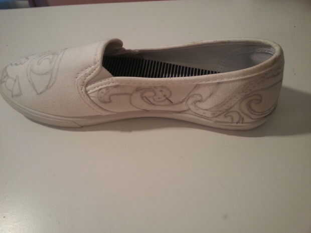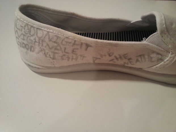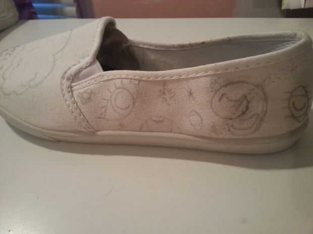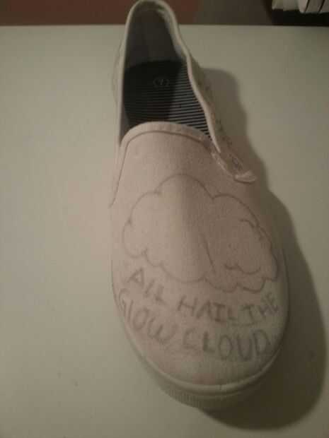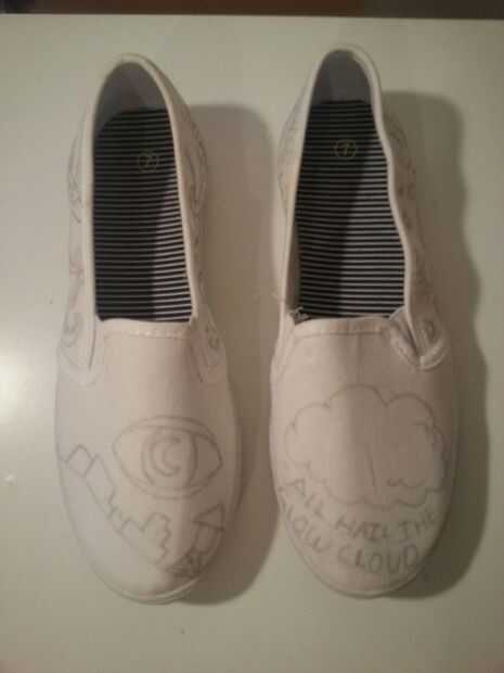 Lo primero que quieres hacer es escuchar ¡ Bienvenido a Nightvale y disfrutar de ella tanto que tienes frases favoritas o aspectos del espectáculo para que tenga algo para dibujar. Fui con la nube del resplandor con "All hail resplandor nube" a través del fondo de un zapato y el arte de tema Nightvale en el otro. En el zapato derecho dibujé tentáculos desde la parte posterior de la zapatilla en ambos lados. Y la izquierda escribió frases como "Goodnight Goodnight de Nightvale" y mi favorita "y ahora el tiempo". Luego en el otro lado de la zapatilla izquierda dibujaba Khoshekh (el gato flotante en cuarto de baño de los hombres) y Nightvale inspirado ojos y las estrellas. En la costura del talón que me iba a pintar de nombre Carlos y Cecil, pero cuando intenté pintarles parecía muy mal. En este momento puede cinta el alma de la zapata si quiere. La última vez que grabó dejó un residuo pegajoso en la planta del pie, así que opté por la cinta vaya alrededor de los zapatos.