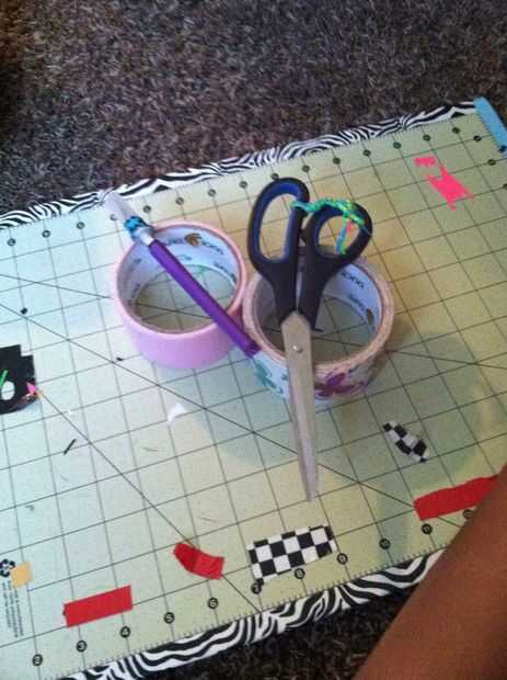 Paso 1: materiales 4 colores de cinta adhesiva, tijeras, tiempo :)Paso 2: Base Measure out 8 foot long strips of one color. Pégalos juntos para hacer una hoja y doblar por la mitad maneras largas. Recortar los bordes de la cinta y doblar todo en terc