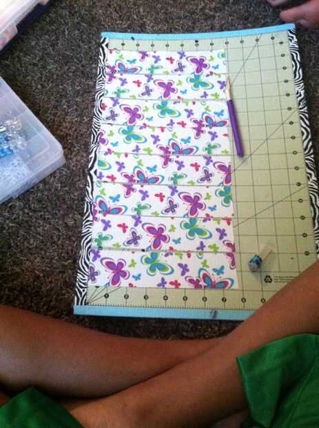 Cosas que necesitará: al menos 2 rollos de distinto color del conducto cinta y un cuchillo del exacto y tabla de cortar. (o tijeras)Paso 1: Corte 8inch dos pedazos de cinta adhesiva para conductos,Paso 2: Girar ellos lado pegajoso hacia arriba.Paso 3