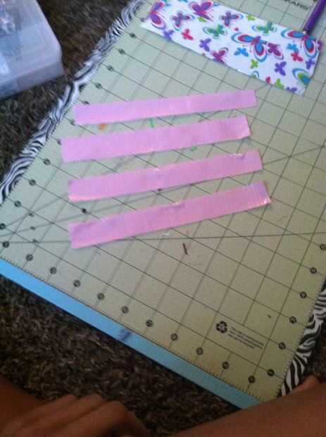 Cosas que necesitará: al menos 2 rollos de distinto color del conducto cinta y un cuchillo del exacto y tabla de cortar. (o tijeras)Paso 1: Corte 8inch dos pedazos de cinta adhesiva para conductos,Paso 2: Girar ellos lado pegajoso hacia arriba.Paso 3
