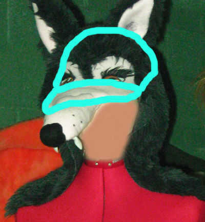 Flexifirm (una entretela muy dura) estuviera pegado a la parte superior e inferior del borde de la tapa para ampliar el hocico del lobo. Algunas piezas bultos de bateo edredón estaban pegadas en la parte superior del hocico.