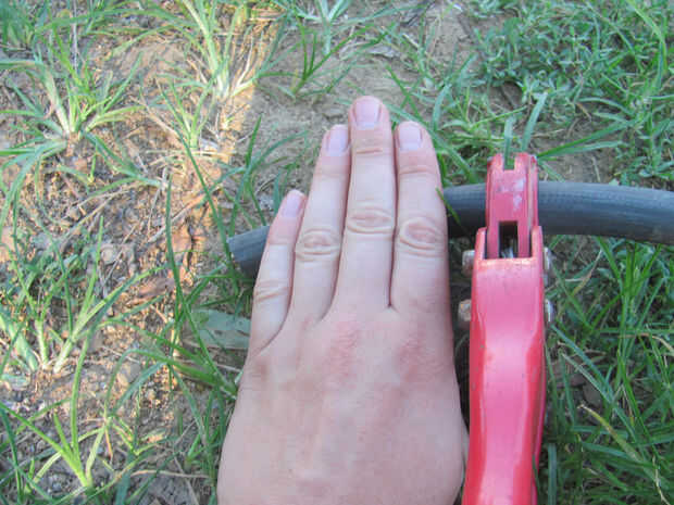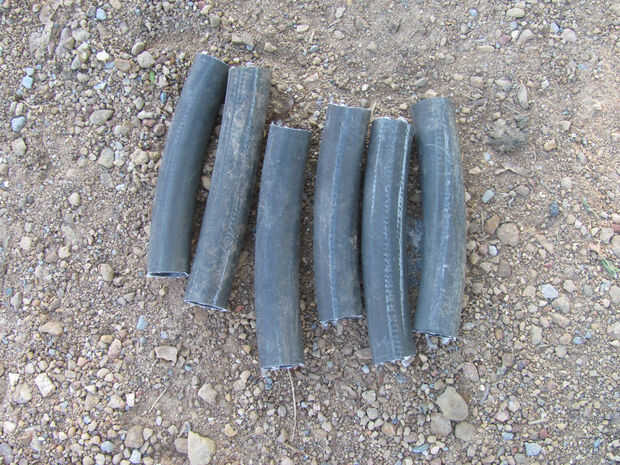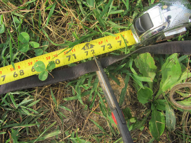 Cortar la correa en seis 6 piezas. La longitud se puede cambiar pero encontré trabajó excelente para una amplia gama de alturas en seis pies. A continuación cortar la manguera en seis 4" piezas. Otra vez la longitud es justo lo que encontré mejor trabajado. Medido por el ancho de mi mano y resultó ser aproximadamente cuatro pulgadas pero no dude en experimentar por su cuenta.