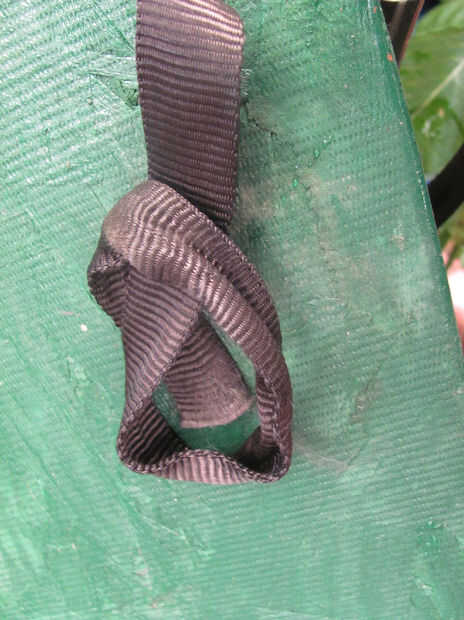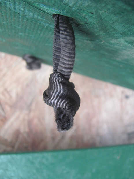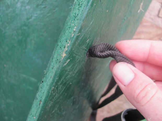 A continuación, enrosque un extremo de la correa a través de uno de los agujeros y haga un nudo simple en la parte inferior de la Junta.