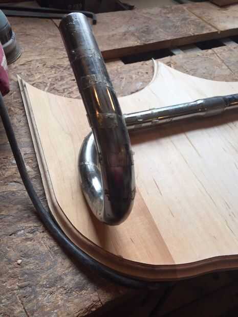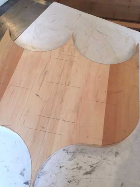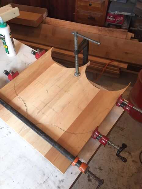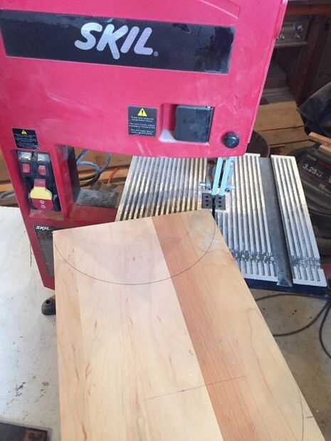Con mi sierra, áspero corté las piezas individuales. Luego coloca las 2 piezas juntas y presenta lugares para colocar 3 galletas entre las juntas para unirlos juntos. Después de cortar los agujeros de galletas y pegar todo para arriba, sujeta las juntas utilizando una combinación de barras y abrazaderas tipo C. (Las abrazaderas tipo C fueron necesarias debido a que se sujeta la barra causada los dos tableros de pico en el centro y no en posición plana).